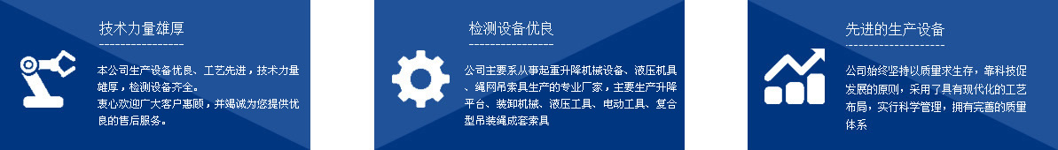 本公司系從事起重升降機械設備、液壓機具、繩網(wǎng)吊索具生產(chǎn)的專業(yè)廠家,主要生產(chǎn)千斤頂、液壓拉馬、軸承加熱器、升降平臺、裝卸機械、液壓工具、電動工具、復合型吊裝繩成套索具、高強纖維柔性吊裝帶、起重鏈條成套索具、橫梁吊具、注塑繩、軟梯、安全帶、安全網(wǎng)等幾大系列、上百種規(guī)格的產(chǎn)品,廣泛應用于電力、油田、大型鋼廠、機電、化工、航空、冶金、機械、鐵道、造紙、港口、建筑等領域。